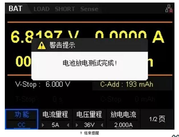 在SDL1030X持續的消耗電能過程中,電池的電壓將會緩慢下降,當電壓降至設置的6V電壓后,電子負載將停止拉載并結束測試,彈出“電池放電測試完成!”的提示框。如圖7所示。
