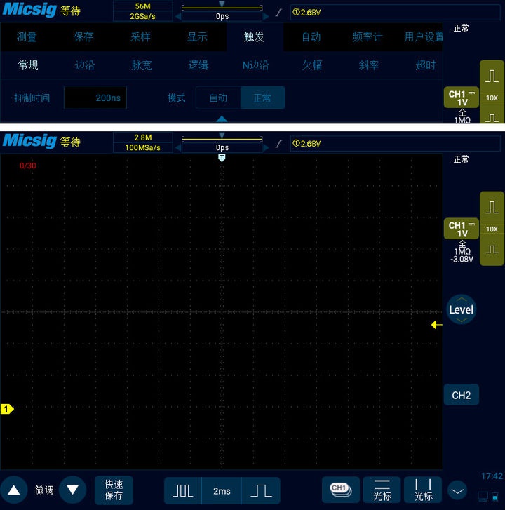 比如說我們要捕獲30個異常情況脈沖,首先我們把示波器的觸發模式改為正常,調節好觸發方式(類似單次觸發的操作),當異常情況信號沒有到來的時候示波器處于等待狀態,可以看到采集到的信號個數是0/30。