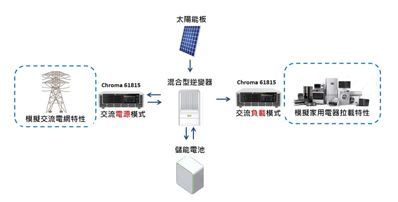 ▲Chroma 61815一機(jī)實(shí)現(xiàn)混合型逆變器的交流電源和交流負(fù)載測(cè)試需求