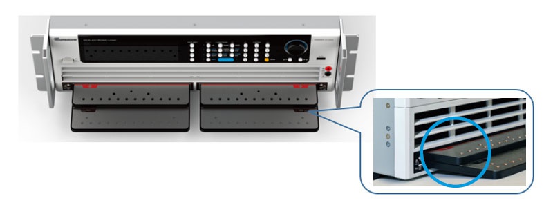 此外,Chroma 63202A-20-2000超低壓直流電子負載特殊的前銅排端子設計,除了方便使用者接線外,左右兩邊銅排相通,并在正負銅排之間增加絕緣飾板以避免短路,還提供多孔鎖附點。此設計提供了低感量連接,對提升負載動態載響應速度有著顯著幫助,使電子負載在0.5V時電流斜率可以達到60A/us。另外Chroma提供選購的負載連接線,特殊設計有超低的自感量,有效改善動態電流測試產生的電壓降或電流過沖的問題。