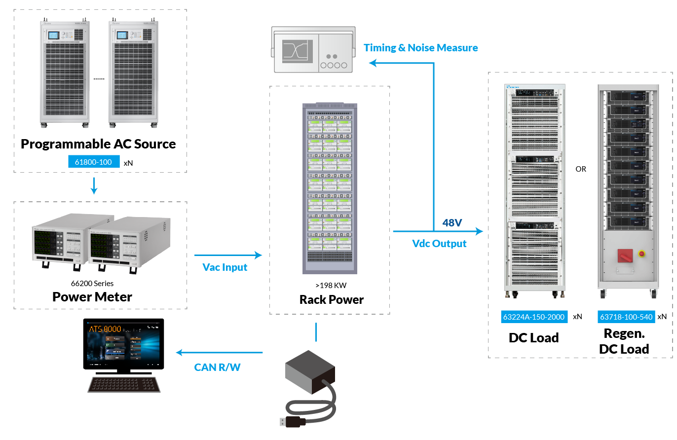 數據中心的服務器電源系統結構日趨復雜,包括電源供應單元(PSU)、備援電池單元(BBU)、電源架(Power Shelf)以及機架電源(Rack Power)等裝置,這些設備必須同時滿足高效能、熱插入能力及PMBUS通訊兼容性的要求。致茂電子以其豐富的電源測試經驗,推出以Chroma 8000為基礎的客制化測試系統,專為服務器電源產品設計,包含多項特色與優勢: